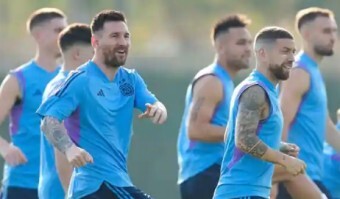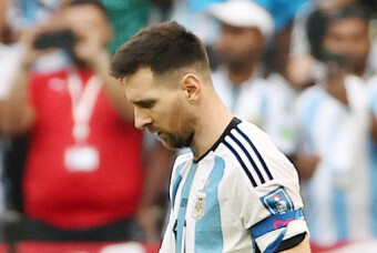 기뻐하는 사우디 선수들 사이의 아르헨티나 선수 메시
